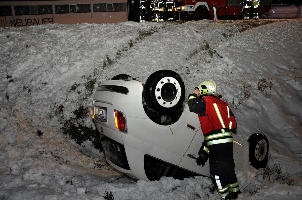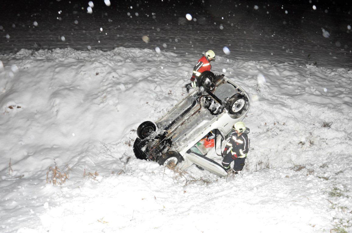 Bei der Lageerkundung stellte Einsatzleiter HBM Parzer Rene fest, dass sich ein Fahrzeug am Dach liegend im Straßengraben befand, die beiden Insassen konnte sich glücklicherweise schon selbst befreien.