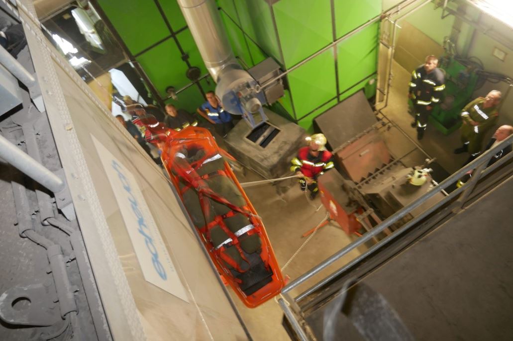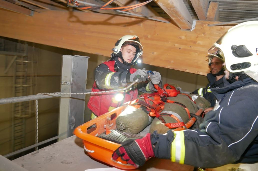 Bei dieser Übung mussten drei abgängige Personen unter Schweren Atemschutz aus dem verrauchten Gebäude gerettet werden, Weiters wurde eine Person mit Hilfe der Korbschleiftrage von einem Silo geborgen.