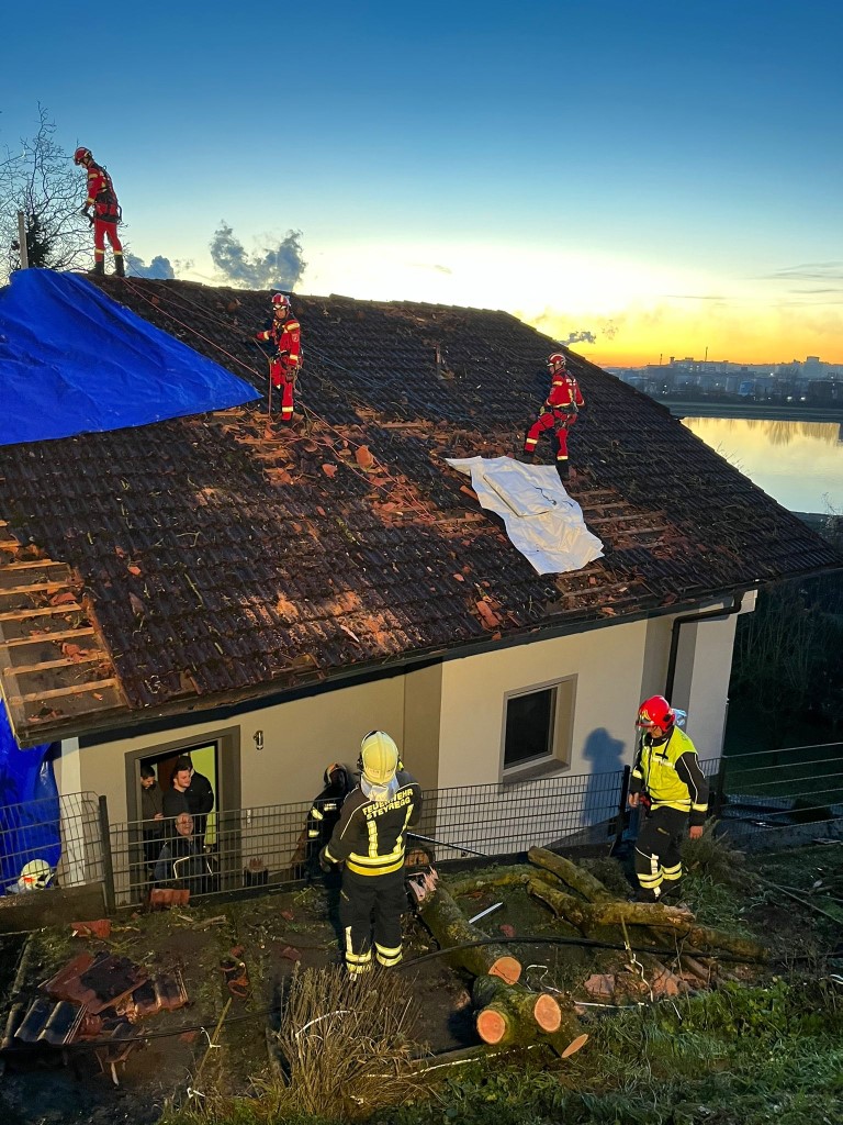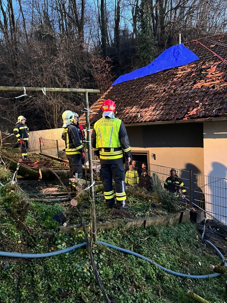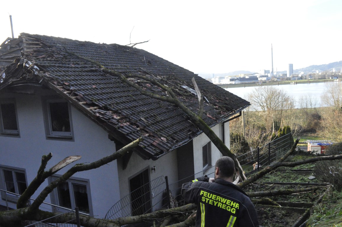 Am ersten Weihnachtsfeiertag ist eine Esche auf ein Wohnhaus in Windegg (Gemeinde Steyregg) gestürzt und hat das Dach und die Stromleitung schwer beschädigt. Für die Freiwillige Feuerwehr Steyregg und die Höhenretter vom Feuerwehrstützpunkt Schweinbach begann ein langwieriger Einsatz.