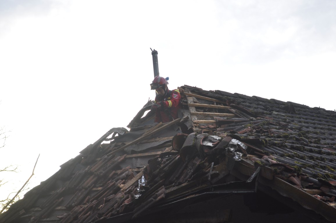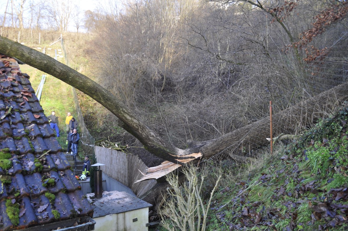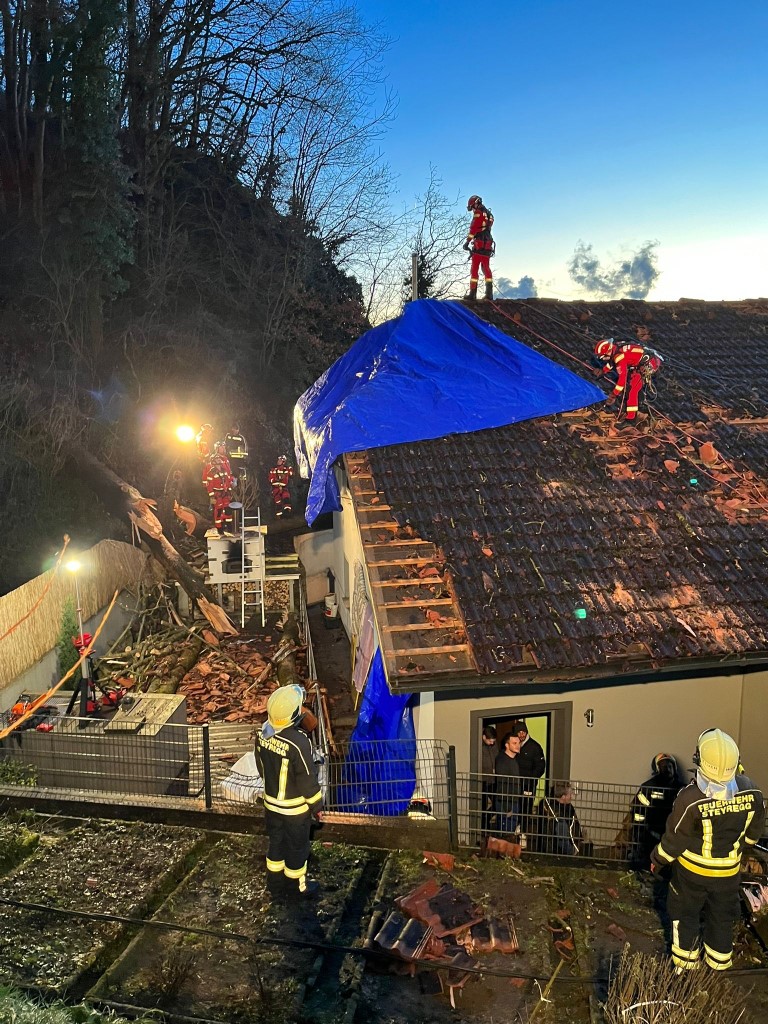 Die Einsatzkräfte haben die Esche entfernt und in einem langwierigen Einsatz das Dach provisorisch mit Planen abgedichtet, damit Regenwasser nicht noch mehr Schaden anrichtet.