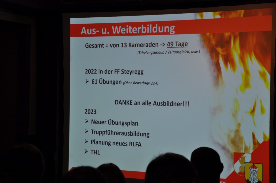 Um für den Einsatz sowie für den gesamten Feuerwehrdienst bestmöglich gerüstet zu sein, wurden von den Feuerwehrmännern und Frauen aus Steyregg insgesamt 49 Urlaubstage geopfert um sich an der OÖ-Landesfeuerwehrschule bzw. über das Bezirks- und Abschnitts-Feuerwehrkommando aus- u. weiterbilden zu lassen.