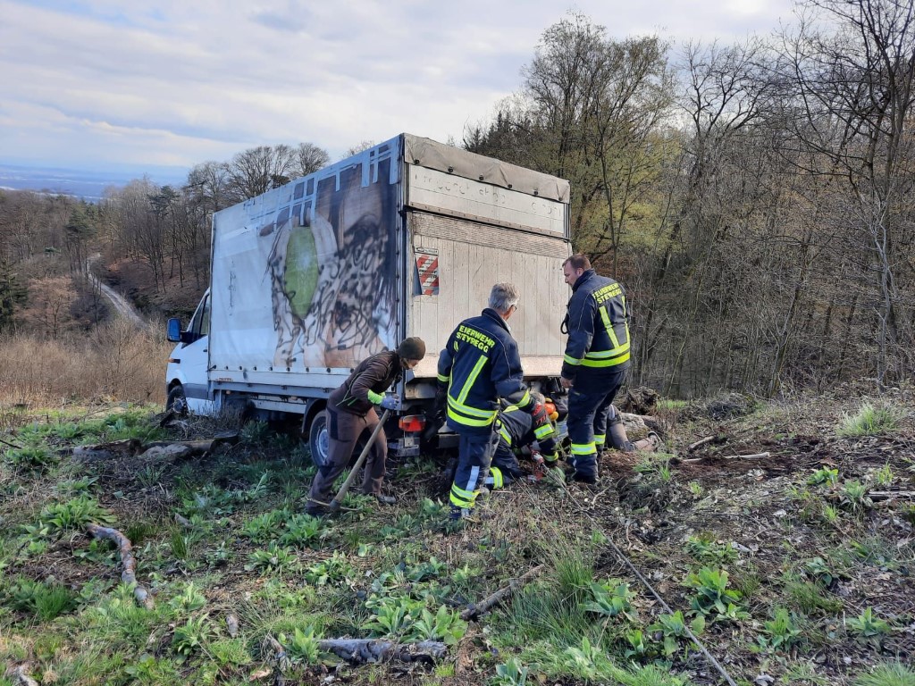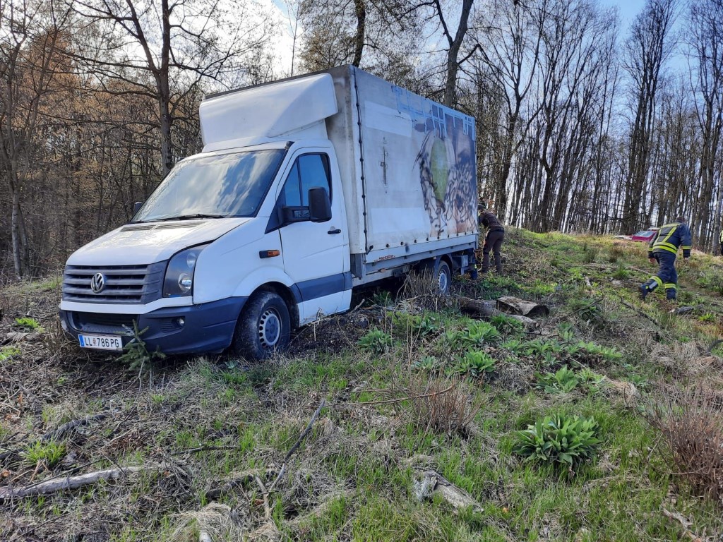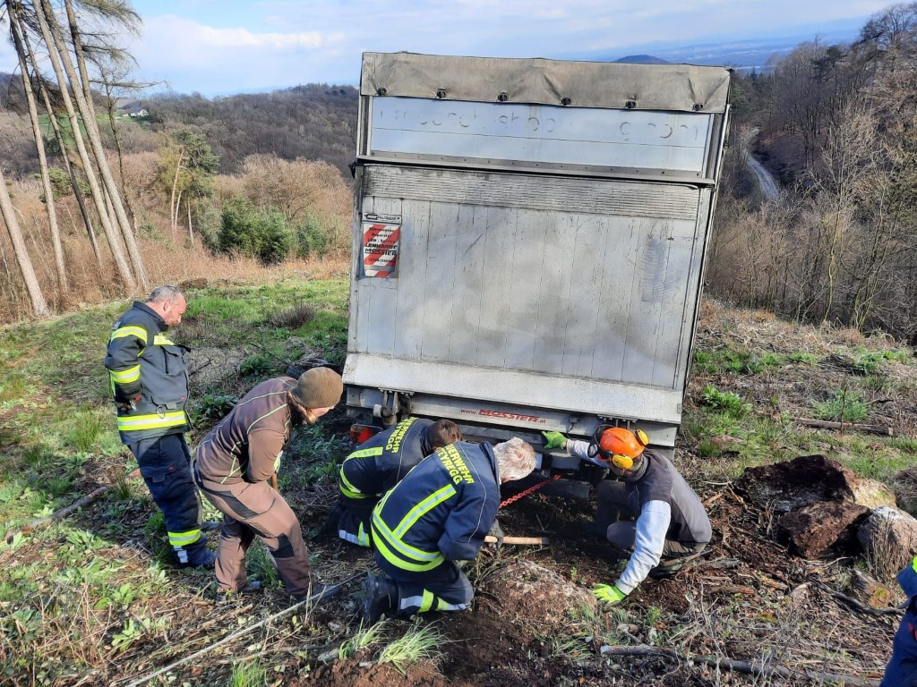 Da sich der Klein-LKW weit abseits befahrbarer Wege befand, wurde mit Unterstützung von Traktor und Forstseilwinde der Fam. Burger der LKW aus seiner mißlichen Lage befreit.