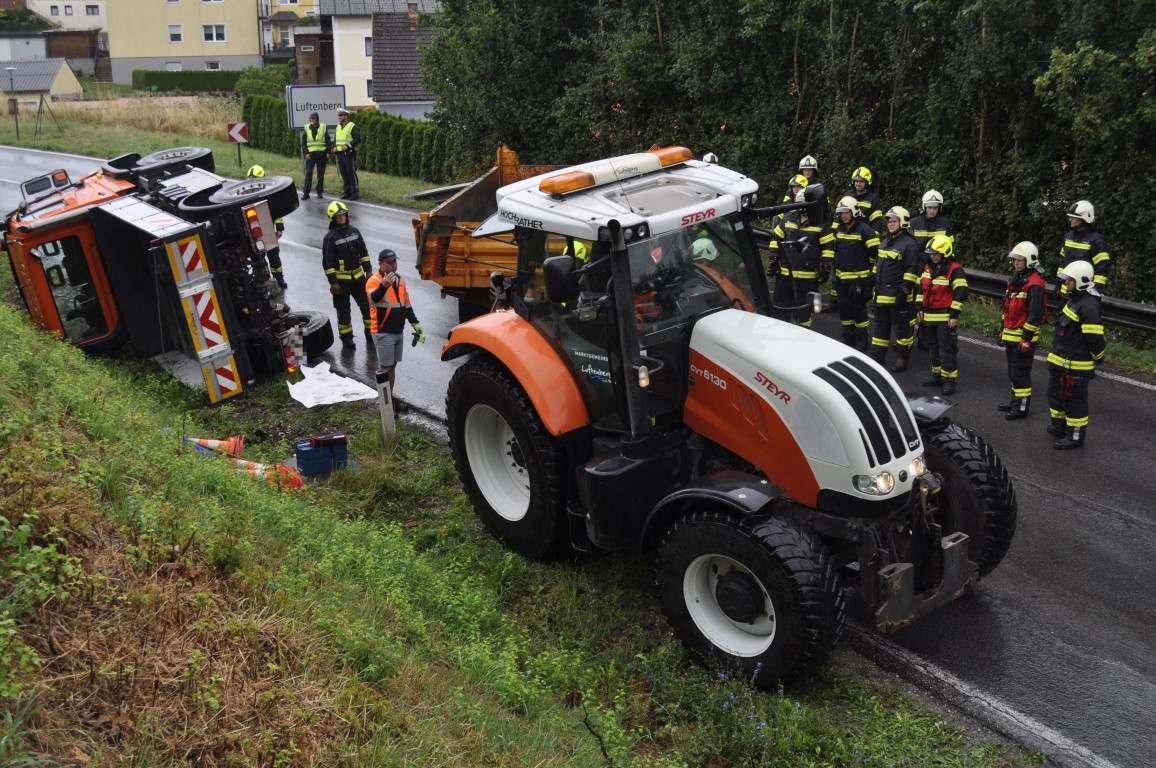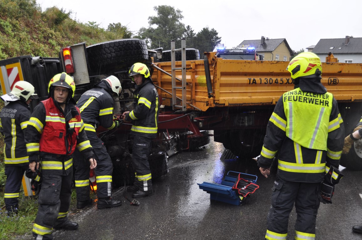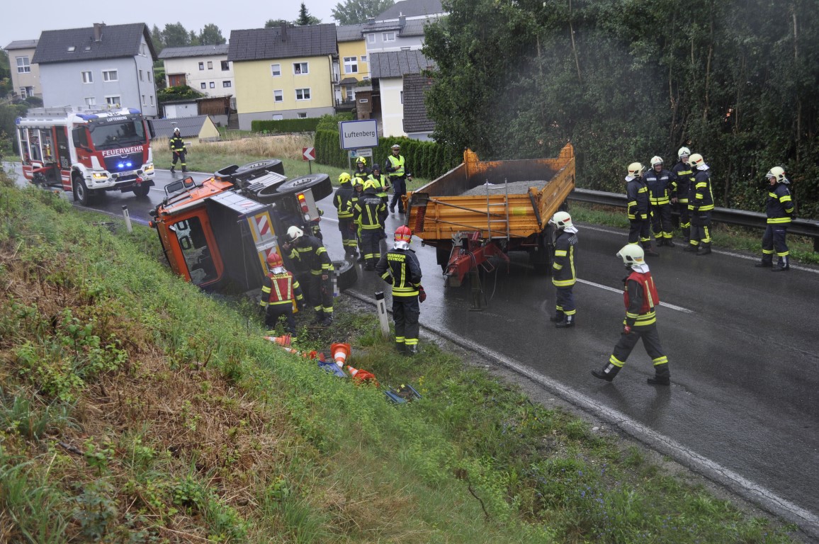Ein Gemeinde-Unimog mit Anhänger war in einer Kurve umgekippt, wodurch eine Person eingeklemmt wurde. Die Feuerwehr Luftenberg hatte bereits erste Rettungsmaßnahmen eingeleitet und die eingeklemmte Person befreit.