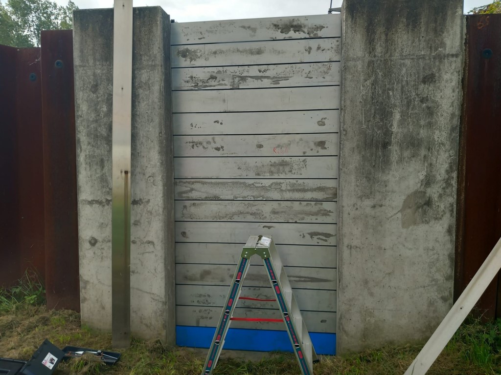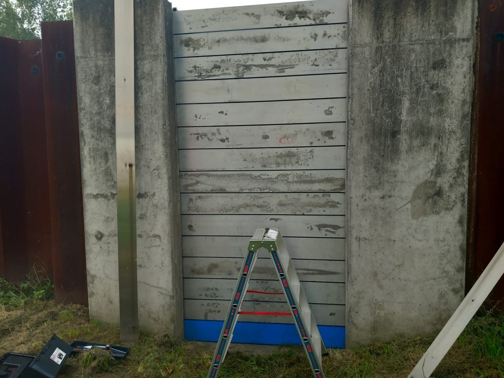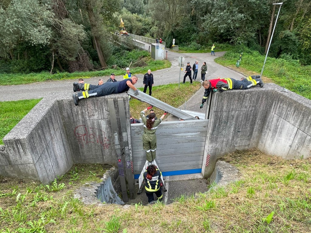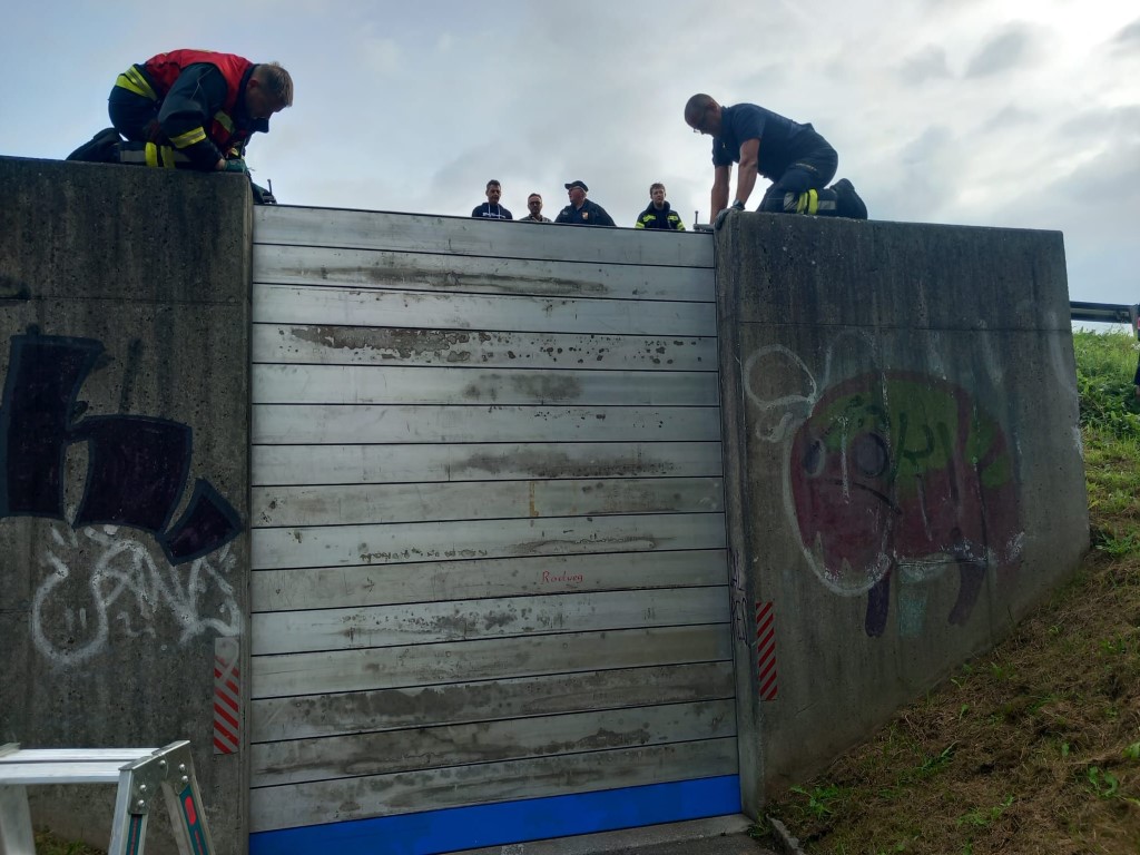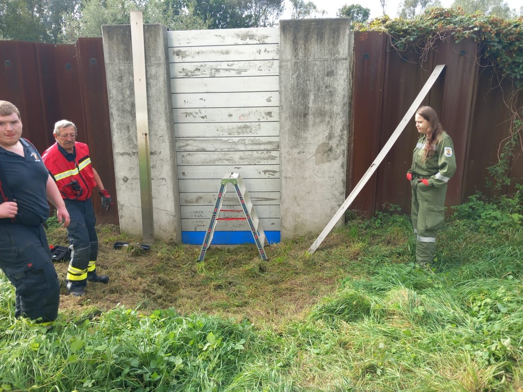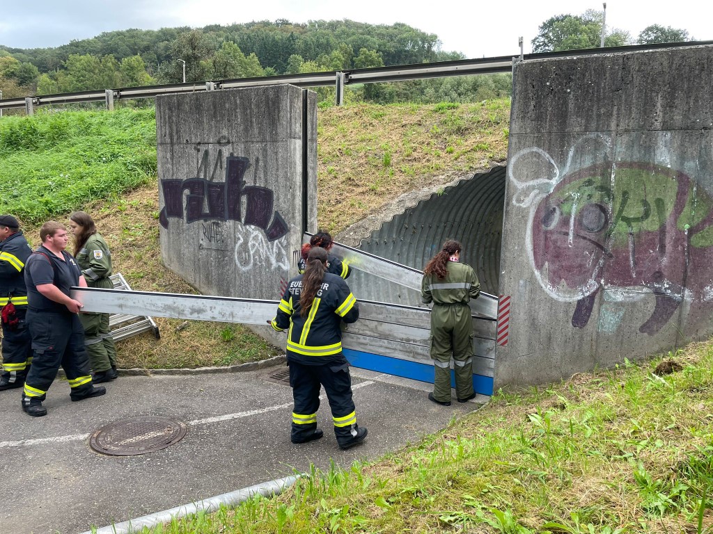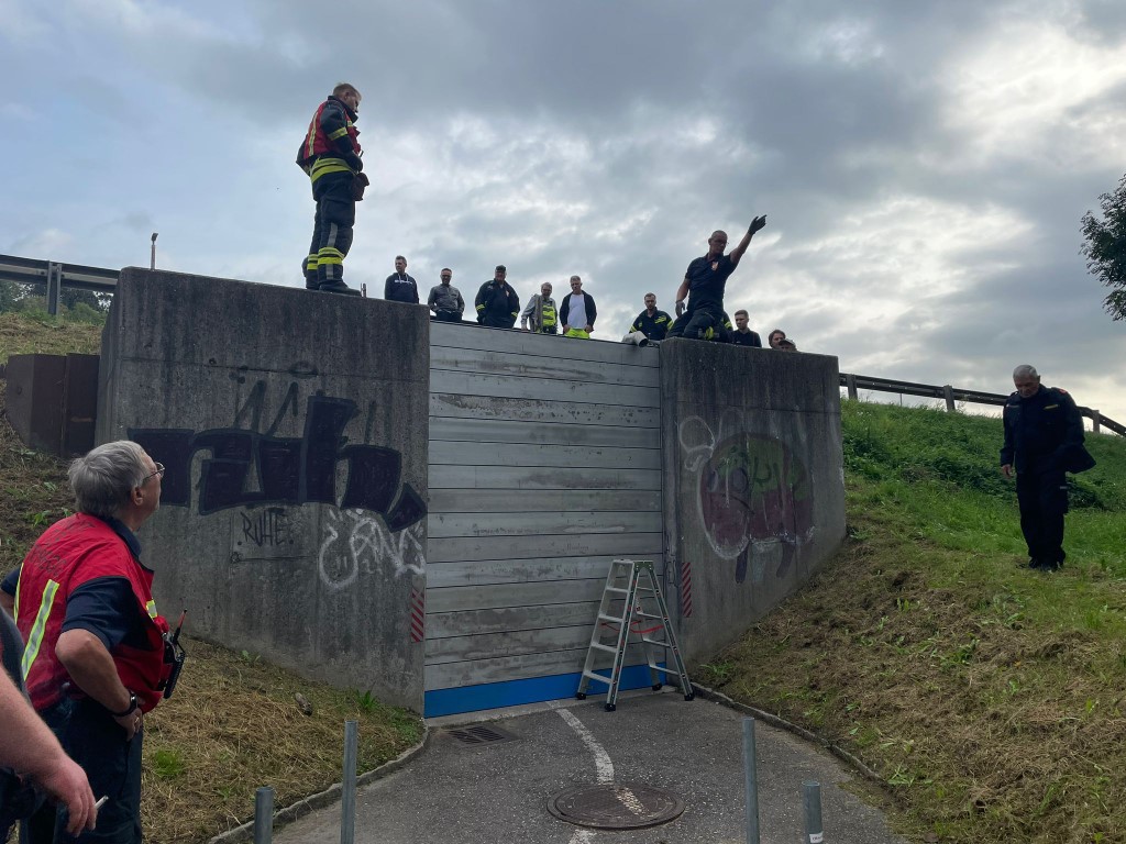 Das Geländer wurde abmontiert, um sicherzustellen, dass sich keine Äste oder Hindernisse verfingen. Gleichzeitig wurde ein Hochwasserschutzsystem aufgebaut, um die Röhre zu sichern.