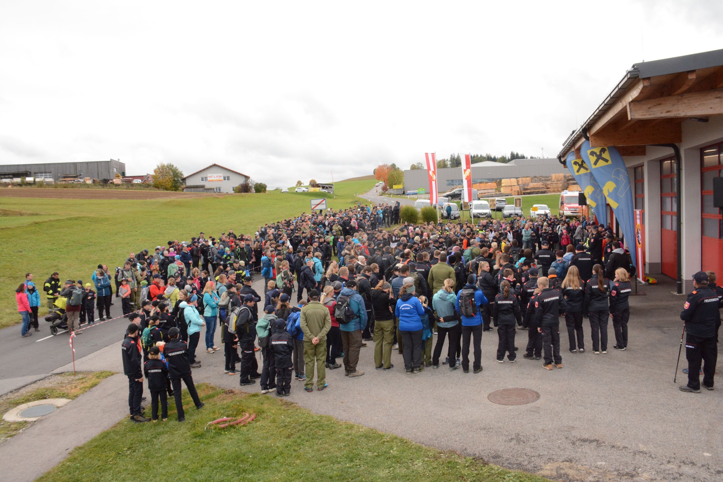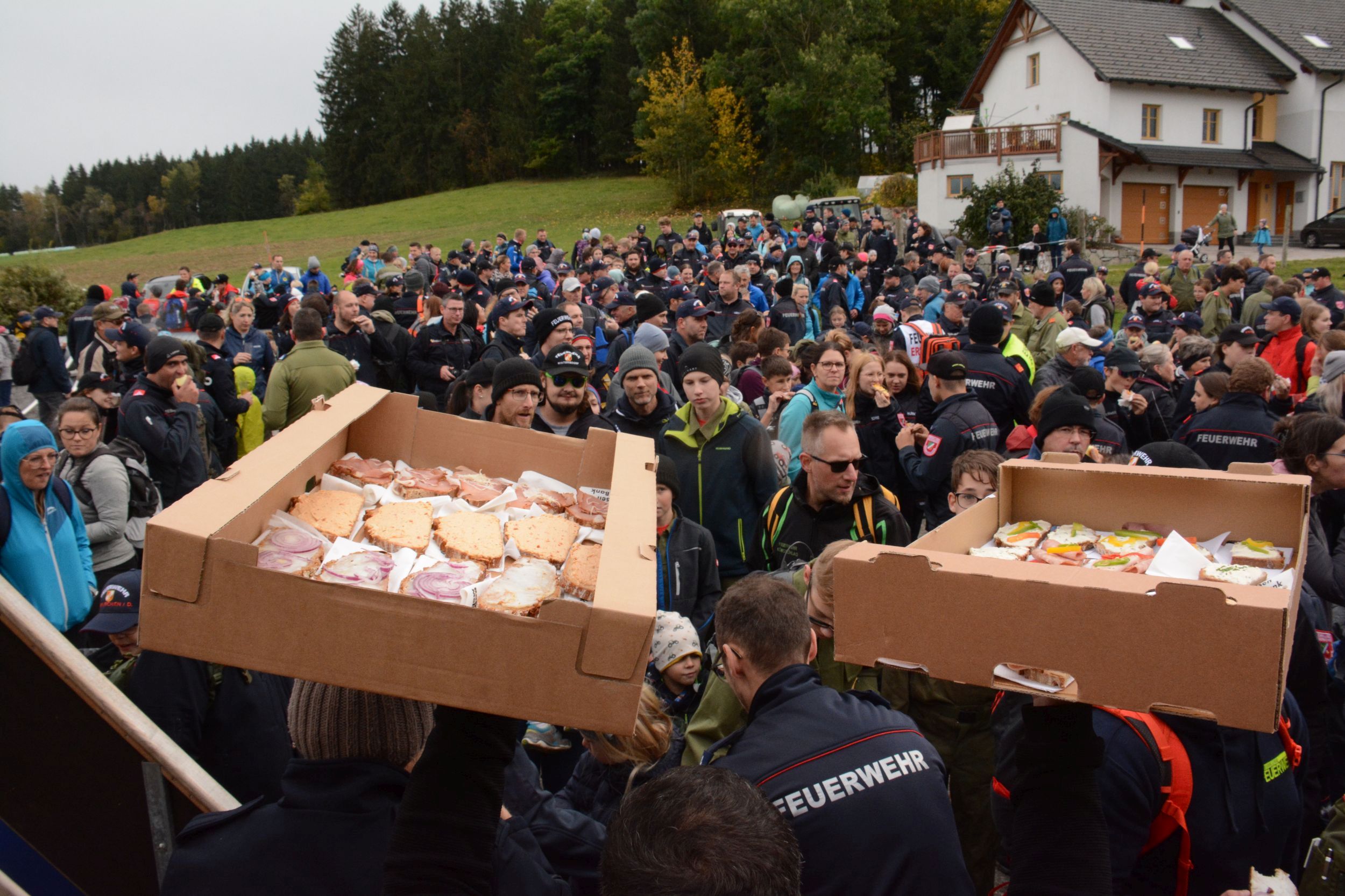 Trotz des unbeständigen Wetters begaben sich insgesamt 750 Teilnehmer gemeinsam mit uns auf den Weg, der sie vom Feuerwehrhaus Schenkenfelden nach Lichtenstein führte. Nach etwa der Hälfte der Strecke erreichten wir eine Verpflegungsstation, die dank der großzügigen Unterstützung der Raiffeisenbanken des Bezirks eingerichtet worden war. Hier konnten wir uns erstmals stärken.