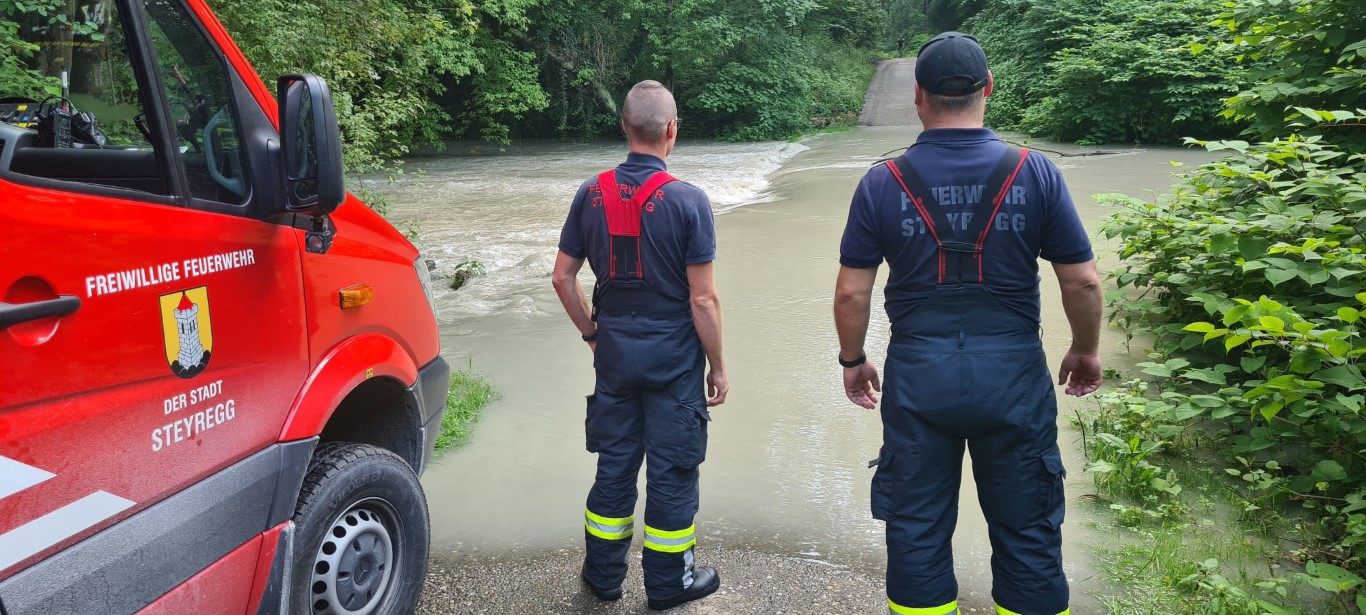 Gemeinsam mit den Vertretern der Stadtgemeinde Steyregg – allen voran Bürgermeister Gerhard Hintringer wurde durch die Führungskräfte der Feuerwehren unter dem Kommando von Pflichtbereichskommandant HBI Rudolf Breuer die Lage beurteilt und sodann entschlossen, dass der mobile Hochwasserdamm vorbereitet wird.